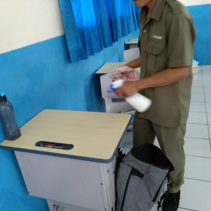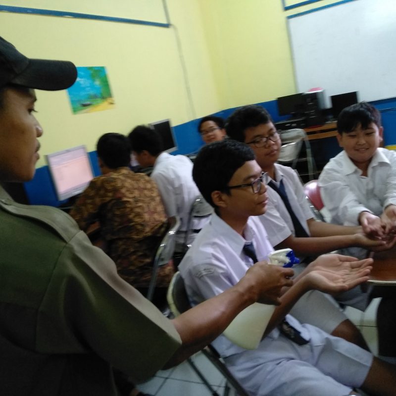 Senin, 10 Februari 2020 pemberian cariran disinfektan kepada seluruh peserta didik untuk pencegahan penyakit, khususnya virus Corona oleh petugas kebersian sekolah (mas salino)