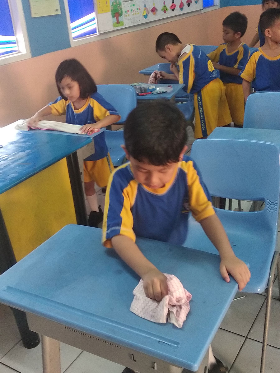 Kegiatan dilanjutkan dengan kegiatan melukis bersama dan piket kelas. Pada kegiatan piket kelas, anak-anak bergotong royong bekerja bersama-sama membersihkan ruang kelas dengan menggunakan peralatan-peralatan kebersihan yang dibawa dari rumah, seperti sapu, kemoceng, sapu lidi, lap, dan pengki.